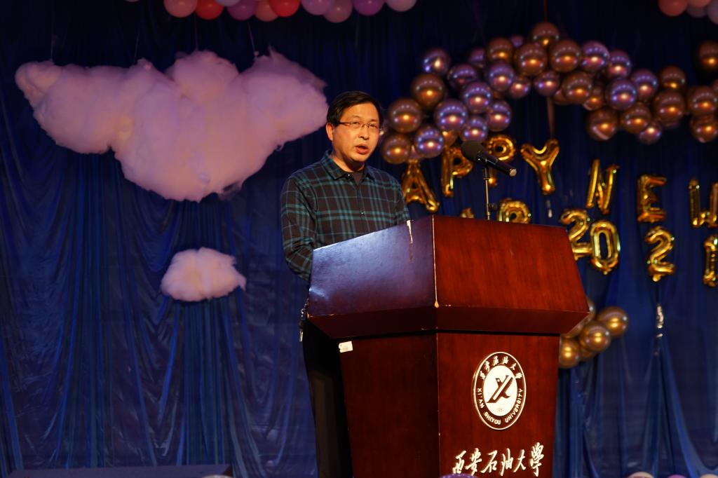 蔡建文书记为晚会致辞,蔡书记首先总结了学院2020年整体工作。然后对辛勤耕耘在教育教学和管理服务工作岗位上的全体教职员工表示感谢,以庚子年历史激励同学们将个人理想融入中国梦,用奋斗点亮青春。最后蔡书记代表学院向全体师生致以新年的问候。